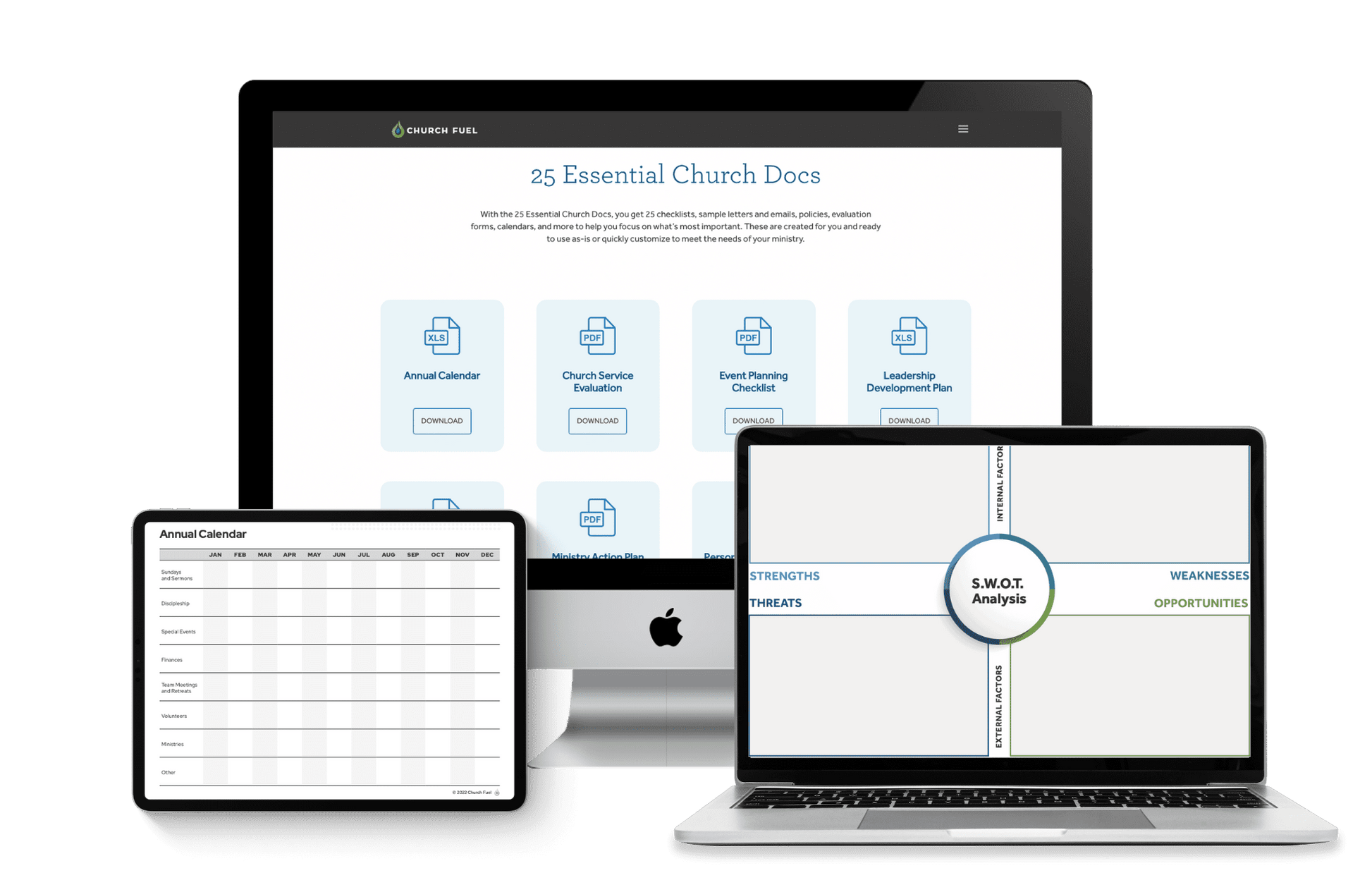 Churches need passion, vision, mission, values, and leaders. But they also need systems, strategies, processes, and documents. In fact, getting organized might be one of the keys to actually accomplishing that mission. This digital download comes with 25 professionally created documents, spreadsheets, flowcharts & templates to help you organize and streamline church operations. PLUS 3 BONUS GUIDES for Pastors! (scroll to learn more)